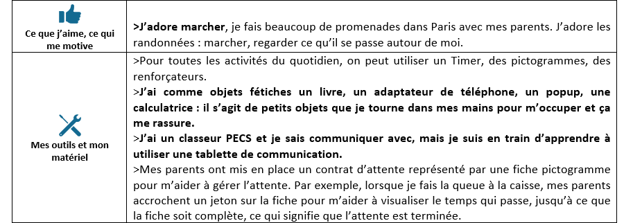 Avec un petit travail de mise en forme, ce document permet de raconter Hector, à la première personne : son trouble bien sûr, mais surtout qui il est, ce qu'il aime, et une foule d'information pratiques sur ses besoins au quotidien ou pour les activités. Le tout sous une forme plutôt plaisante à lire.